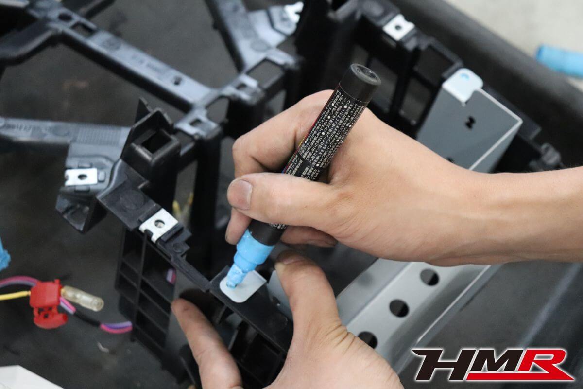 ナビを支えるフレームを仮当てしています。