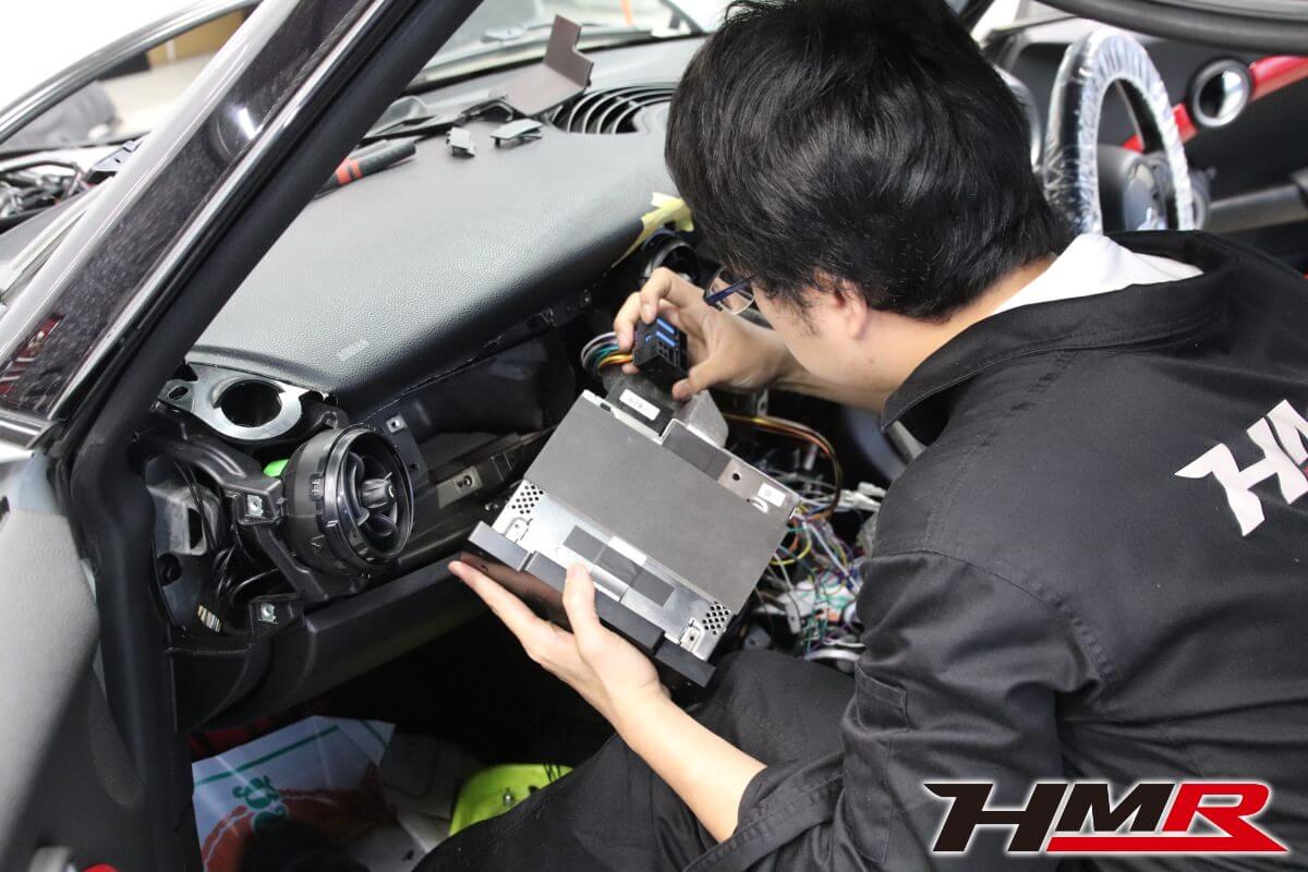 メーター下に付いていたCDプレイヤーのユニットを接続して、グローブボックスだったスペースに入れようとしています。メカニックのホリグチによるとこれはメーター類も動かすユニットでもあるので移設をして接続する必要があると教えてくれました。