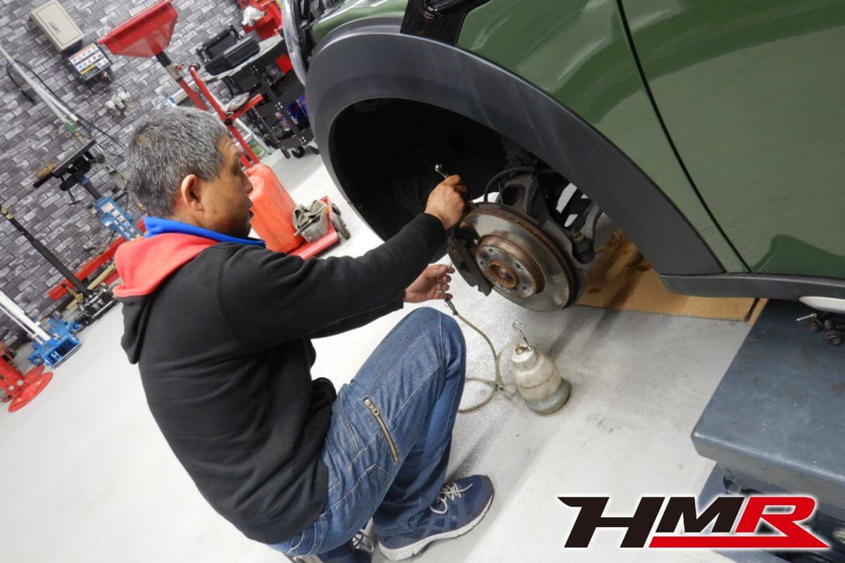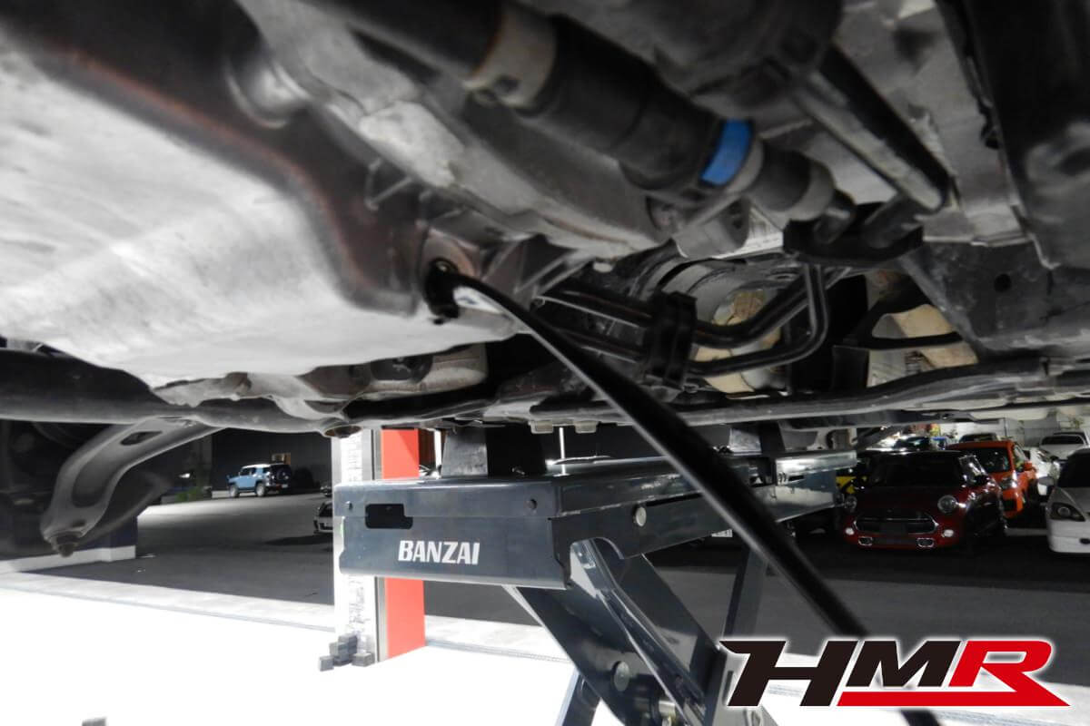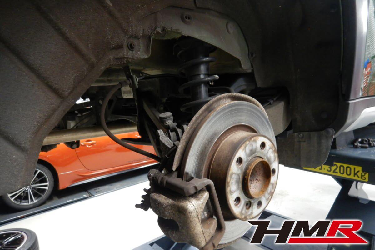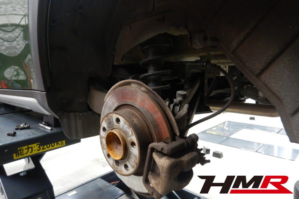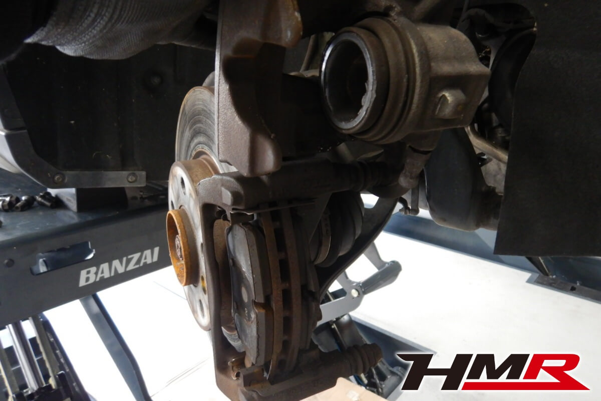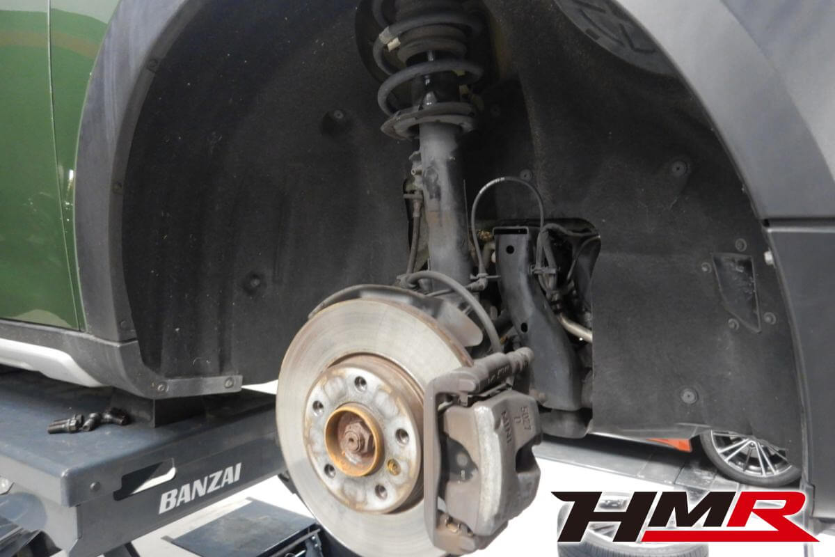 続いてリフトアップして足廻りをチェックしていきます。まず最初にハブベアリングとボールジョイントのガタがないかチェックしていきます。特に問題ありませんでした。消耗が進んでいくと、ハンドリングが安定しなくなり、最悪ベアリングが焼け付いて走行できない恐れもありますので定期的な点検をおススメいたします。