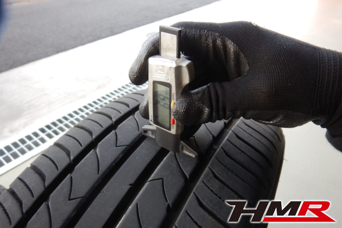 タイヤ溝の残量をチェックしていきます。フロント・リアともに約6mmでした。まだ交換しなくても大丈夫ですね。