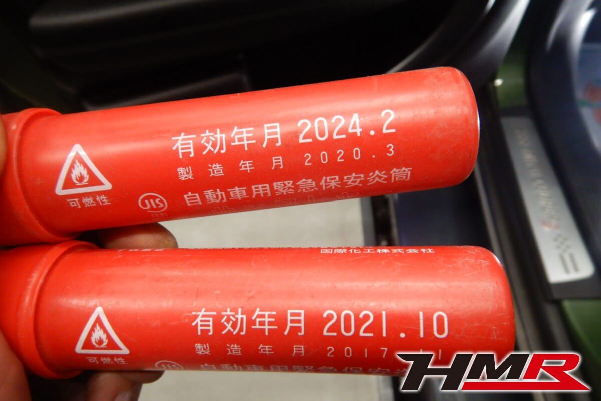 サンフレアの有効期限が切れていたので交換します。サンフレアは有効期限が切れていても車載されていれば車検は問題ありません。但しいざとなった時に使えるとは限りませんのでHMRでは有効期限が切れたものは交換させていただいております。