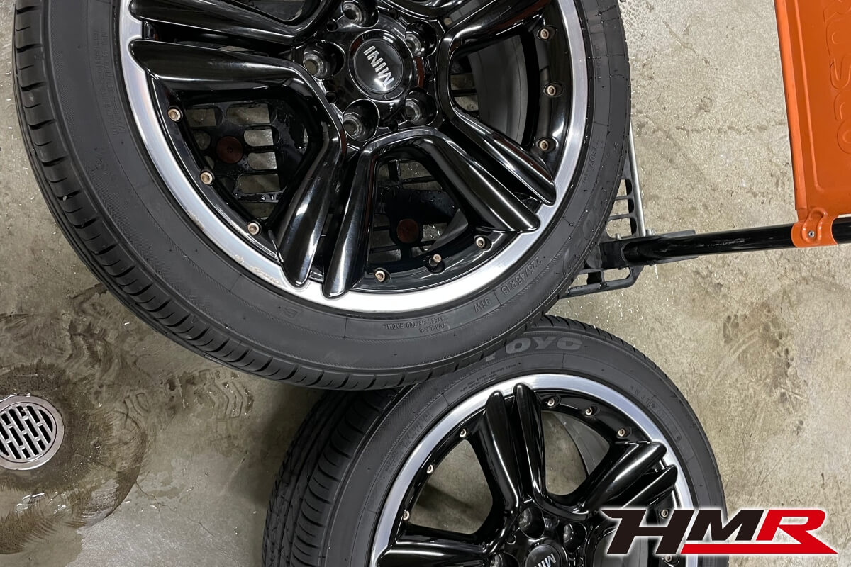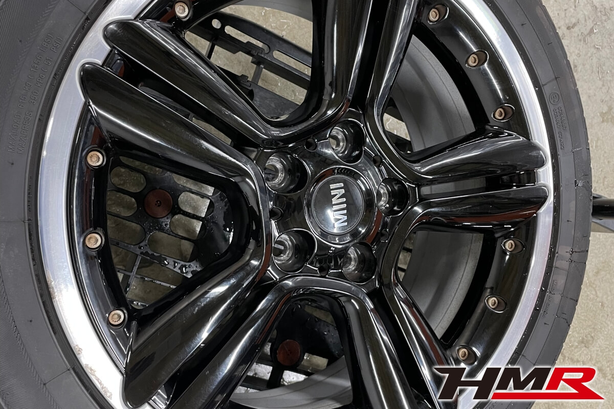 次にホイールコーティングを施工していきます。MINIといった欧州車は、高いブレーキ性能と引き換えにブレーキダストが多く、あっという間にキレイなホイールが真っ黒になってしまいます。ホイールダストを洗い落とすクリーナーがありますが、必ずしも全てキレイに落とせるわけでもなく、塗布した瞬間の不快な匂いなどがあります。人間で言う靴に相当するホイールをキレイに保つことでクルマ全体もより輝きます。