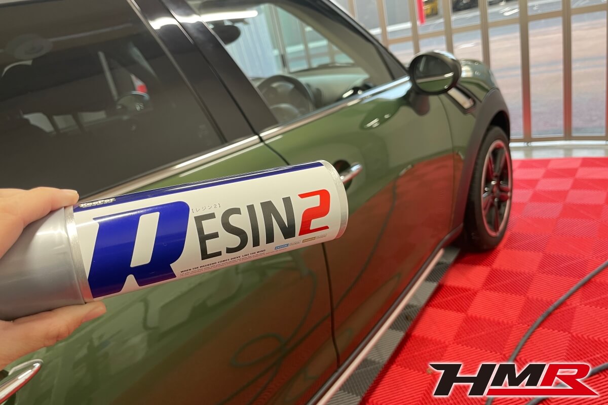 それでは二層目の「レジン被膜」を塗っていきます。この被膜は更なる輝きを与えながらミネラルの付着を防ぎウォータスポットができづらくしてくれます。またゴムや樹脂の部分に艶を出してくれるのもこの被膜です。