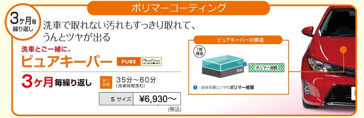 ピュアキーパーは、通常の洗車ではなかなか取れない頑固な汚れが取れやすくなり塗装面を保護し、更にポリマーコーティングです。一度の施工にかかる時間が短く(※お車の汚れ方、車種などによって施工時間は増減します)、お手軽に1ワンク上のツヤを得られます。3ヶ月毎の施工をおススメしており、施工を重ねることでコーティング膜がより強固なものになり更に塗装がよりツヤのあるキレイな状態になっていきます。比較的マメに洗車をされる方におススメのコースとなります。