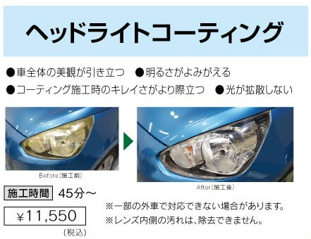 クルマにとって最も印象づけるヘッドライト、そして安全運転に無くてはならない箇所です。しかし長い時間、外気に曝されると熱や紫外線によってヘッドライトカバー表面が白ボケしたり、黄ばみが発生してしまいクルマ全体の美観を損なうだけでなく十分な視界を確保できなくなってしまいます。ヘッドライトの綺麗さでクルマ全体の印象も大きく変わりますのでおススメしているオプションメニューです。これ以外にも様々なオプションメニューがございますので気になりましたらお気軽に専門スタッフにお問い合わせください