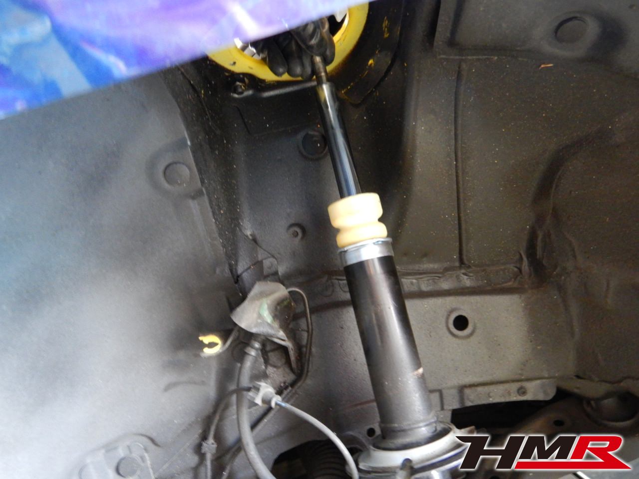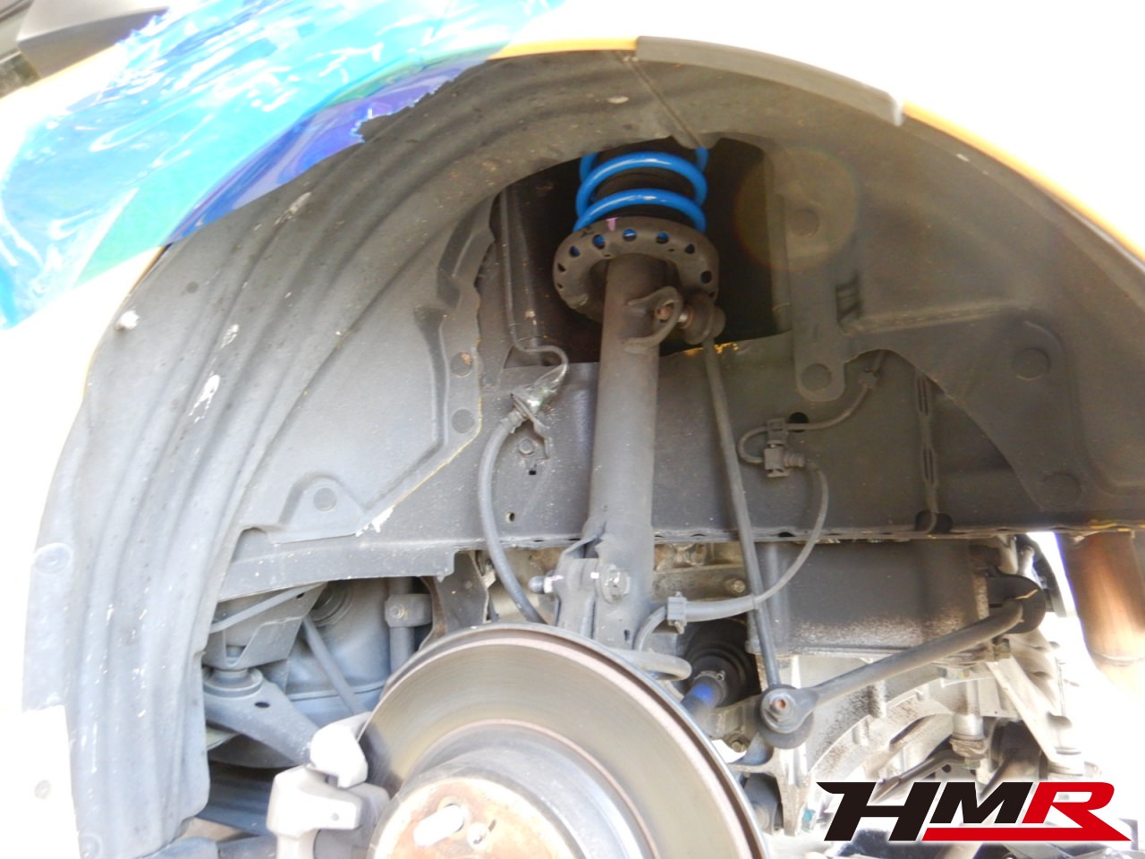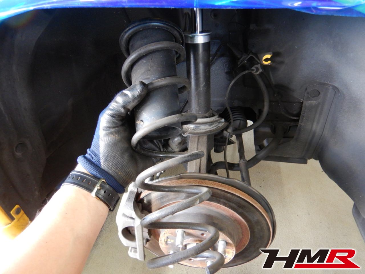 ダウンコイルスプリングを装着したら車体に取付けて「1G締め」をしていきます。この「1G締め」とは、タイヤが地面に設置した状態を再現し、足回り各部の締め直しを行う作業です。これによりサスペンションがよりスムーズに稼働します。