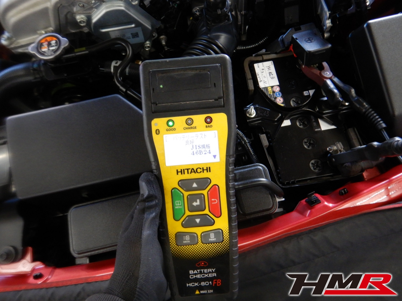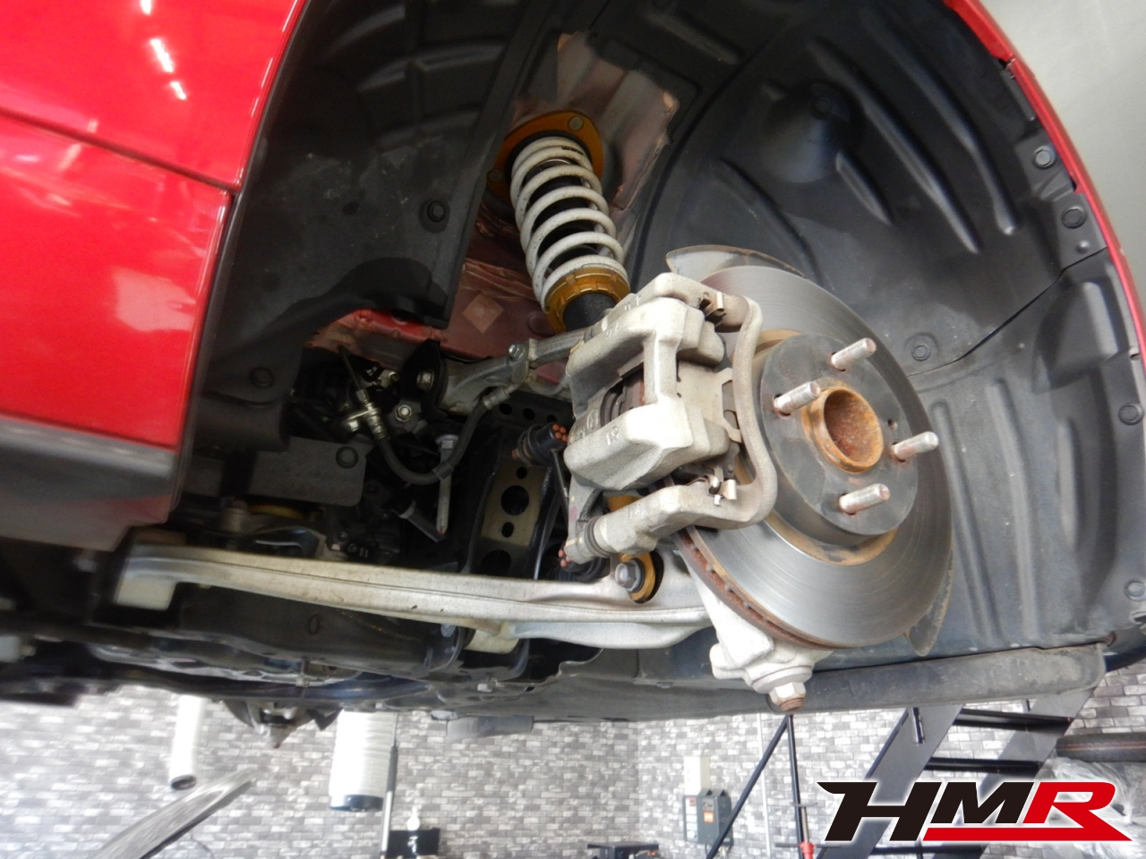 まずエンジンルーム周りを点検していきます。バッテリーの健全性をチェックしていきます。特に問題ありませんでした。バッテリーの交換時期は使用状況によりますが3〜5年のサイクルで交換することをおススメいたします。また寒い時期になるとバッテリー上がりが多くなります。少しでもマメにエンジンを掛けて充電したり、カー用品店などで購入できる充電器を用意しておくといいでしょう。 次にインテークホースの点検を行いましたが問題ありませんでした。インテークホースは経年劣化によって蛇腹部分に亀裂が入ることがあります。そこからエアフィルターを通さない空気を吸ってしまいエンジン不調に繋がる可能性があります。ボンネット開ければ目視できますので定期的な点検をおススメいたします。  エアフィルターの点検をしていきます。目立つ様なゴミや汚れは無く問題ありませんでした。エアフィルターは、外から取り込んだ空気に含まれる砂・チリなどの異物を受け止めてくれ、きれいな空気をエンジンに送り入れる役目を担っています。汚れで目詰まりを起こすと燃費悪化やエンジン本来の性能を発揮できなくなります。エアフィルターボックスは簡単に開けることができますので定期的な点検をおススメします。次に冷却系廻りを点検していきます。ラジエターホースに漏れはありませんでした。経年劣化していくと亀裂が入りそこから冷却水が漏れてしまいエンジンがオーバーヒートを起こす可能性があります。定期的な点検をおススメいたします。 続いて補機ベルトの状態およびオートテンショナーの異音やガタが無いかを点検していきます。問題ありませんでした。ベルトが切れてしまうとバッテリー充電が出来なくなり最悪エンジンが停止する恐れがあります。定期的な点検をおススメいたします。 続いてプラグの点検を行いました。4本とも特に問題ありませんでした。先端の部分がひどく汚れてしまうとエンジンが掛かりづらくなったり、走行中に失火が起こり故障の原因となります。エンジンが掛かりづらくなるなどの症状が出た場合は当店にご相談ください。 ブレーキマスターシリンダーを点検しました。オイル滲み・漏れもなく問題ありませんでした。経年劣化によるリザーバータンクのヒビ割れが原因でフルード漏れが起こりやすい箇所です。   続いてリフトアップして足廻りをチェックしていきます。まず最初にタイヤを縦横に揺らしてハブベアリングとボールジョイントのガタがないかチェックを行います。特に問題ありませんでした。走行中に異音やハンドルのガタつきなどを感じた場合は当店へお早めにご相談下さい。 リフトアップして下廻りをチェックしていきます。特に目立つようなキズやサビもなくきれいな状態でした。 足廻りのブッシュ・ブーツをチェックしていきます。ブッシュ・ブーツにヒビが入ってしまいそのままにしておくとそこからグリスが漏れ出したり、異物が侵入して足廻りの機能に支障をきたすだけではなく、車検を通過できなくなってしまいます。またそれ以外にもダンパーのオイル漏れがないかを点検していきます。 HKS車高調にオイル漏れやロックシートの緩みはなく問題ありませんでした。ブレーキ廻りの点検をしていきます。まずブレーキキャリパーシールの状態やキャリパーピストンを確認していきます。特に問題ありませんでした。  キャリパーシールが劣化することでピストン内に水分が侵入することでサビが発生します。それをそのまま放置しているとキャリパーの動きを阻害されてしまい、ブレーキの引きずり症状や固着を引き起こしてしまう可能性があります。 ブレーキパッドの残量をチェックしていきます。フロント5mm・リア6mmでした。