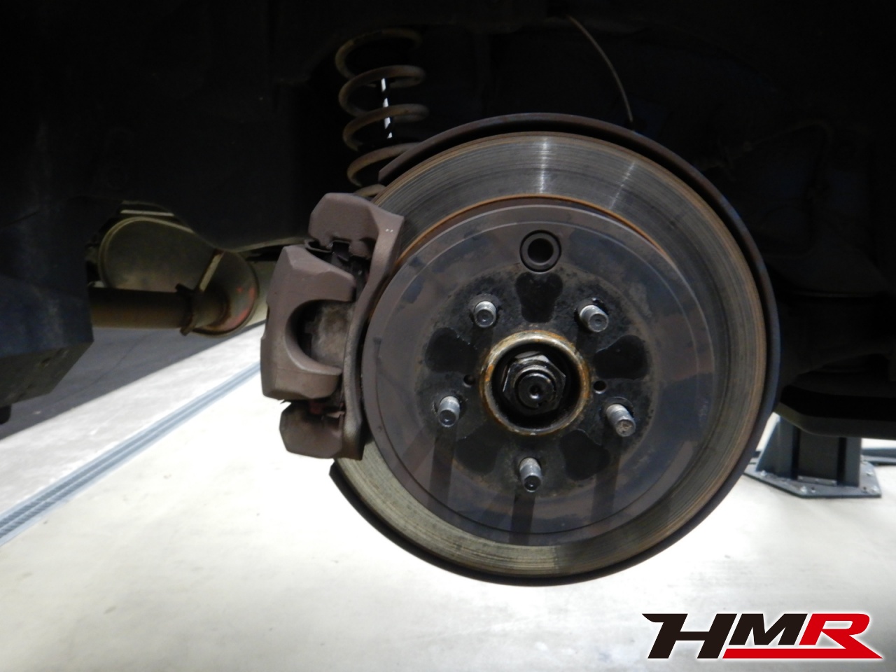 ブレーキ廻りの点検をしていきます。まずはブレーキローターの状態を点検します。摩耗が進んできていますね。次回ブレーキパッド交換時にブレーキローターの交換も一緒におススメいたします。