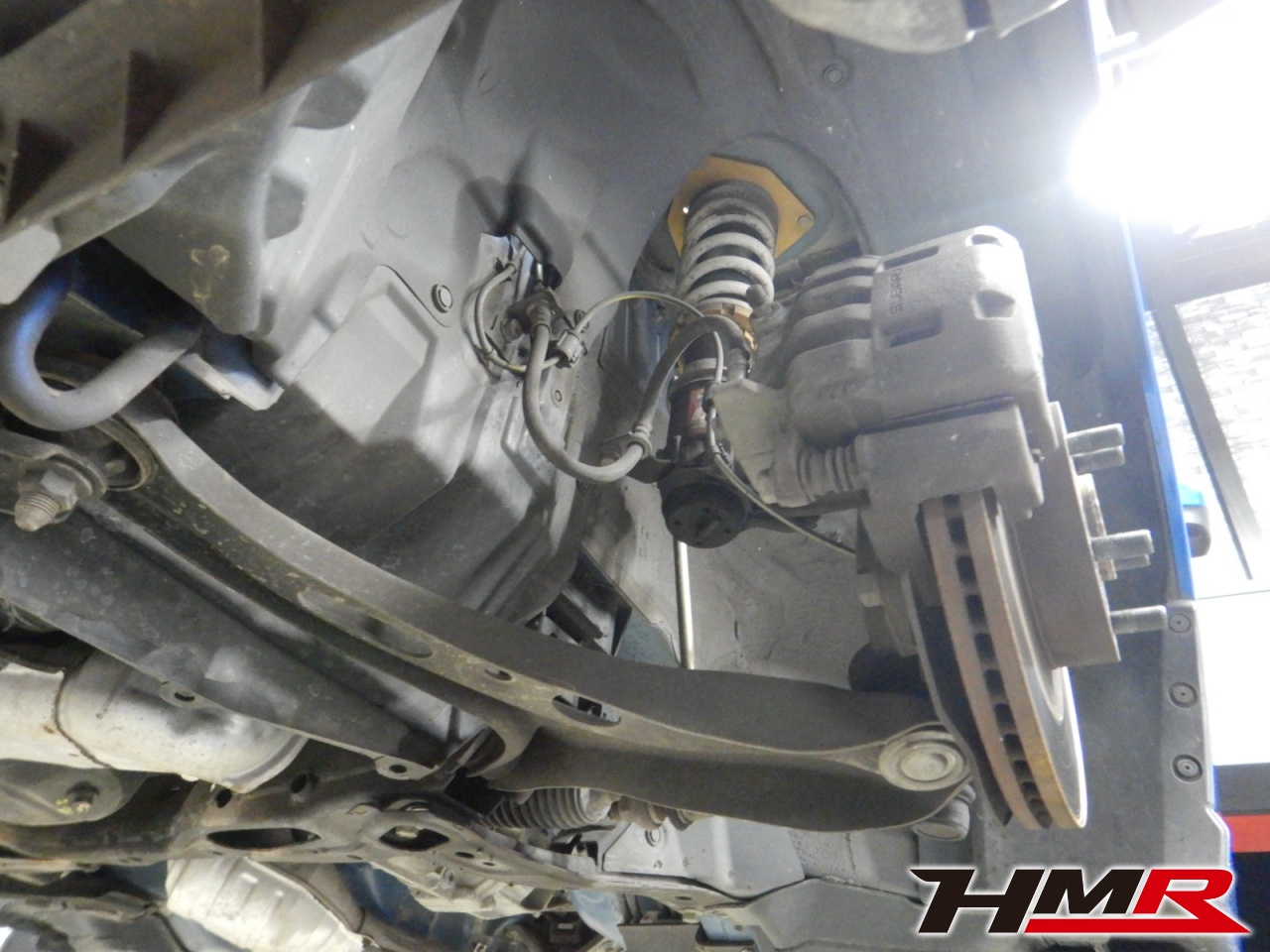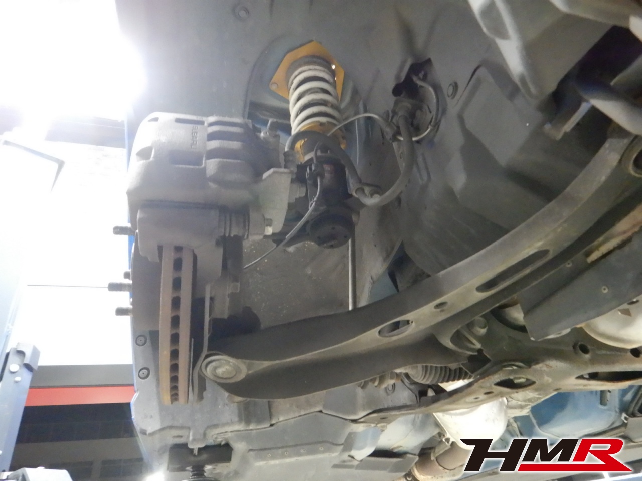 リフトアップして足廻りをチェックしていきます。まず最初にタイヤを縦横に揺らしてハブベアリングとボールジョイントのガタがないかチェックを行います。つづいてタイヤを回してベアリングの状態とブレーキの引きずりをチェックします。走行中に異音やハンドルのガタつきなどを感じた場合は当店へお早めにご相談下さい。