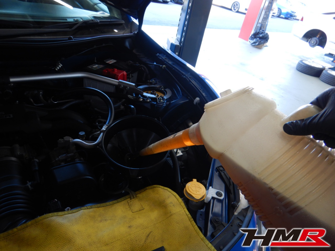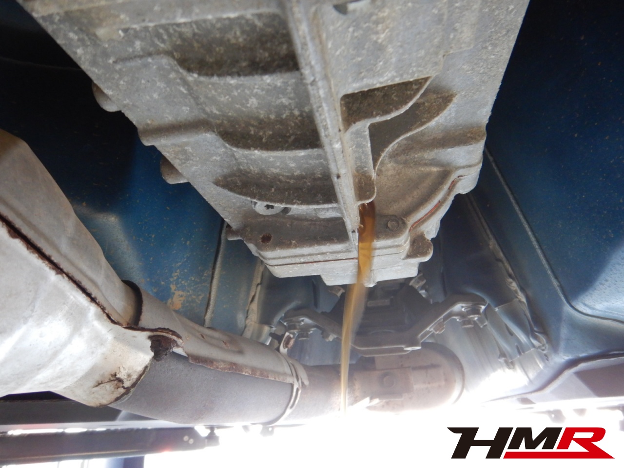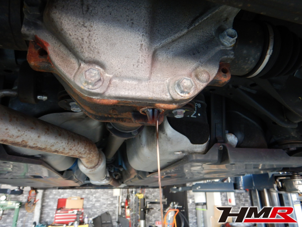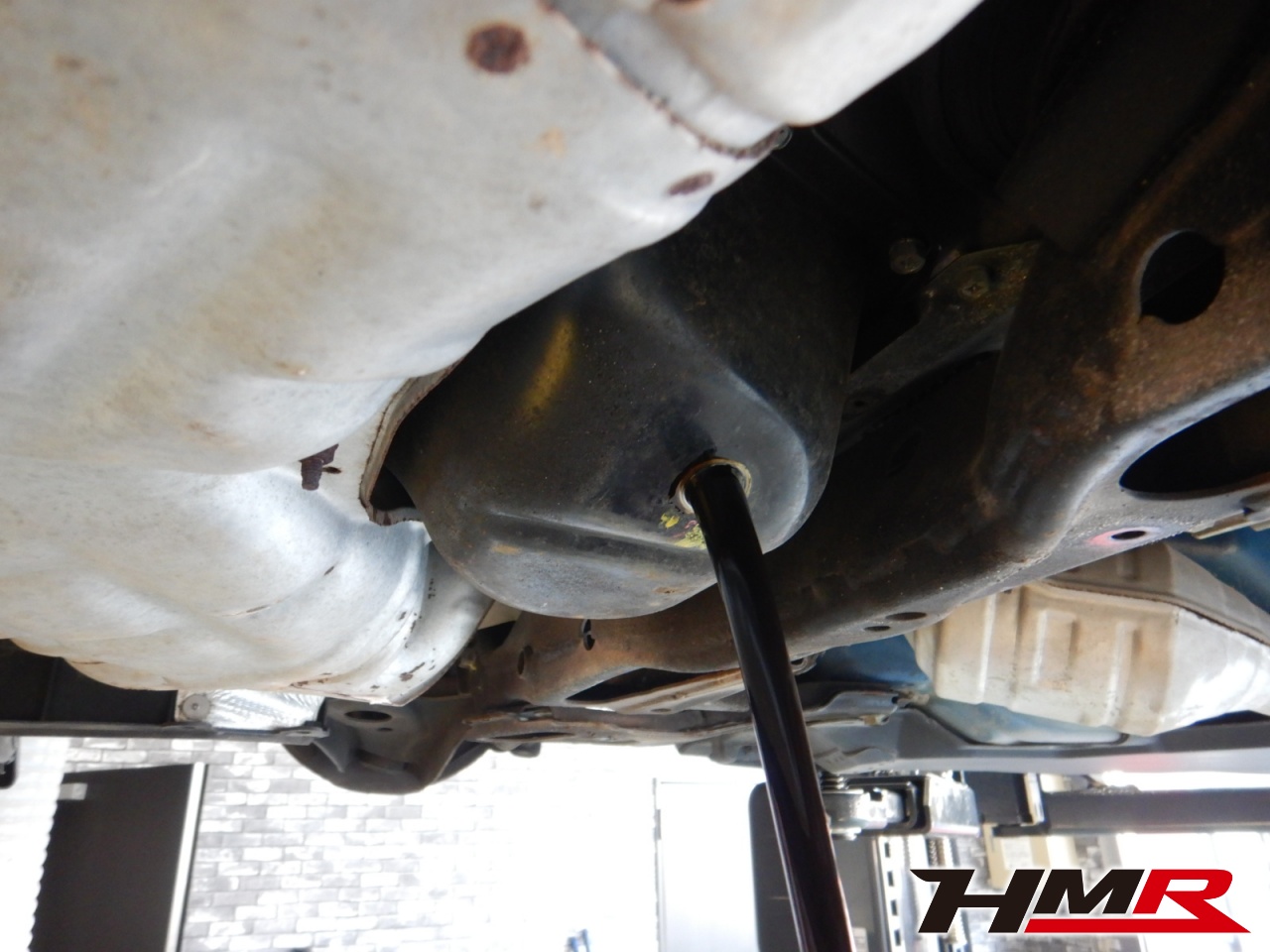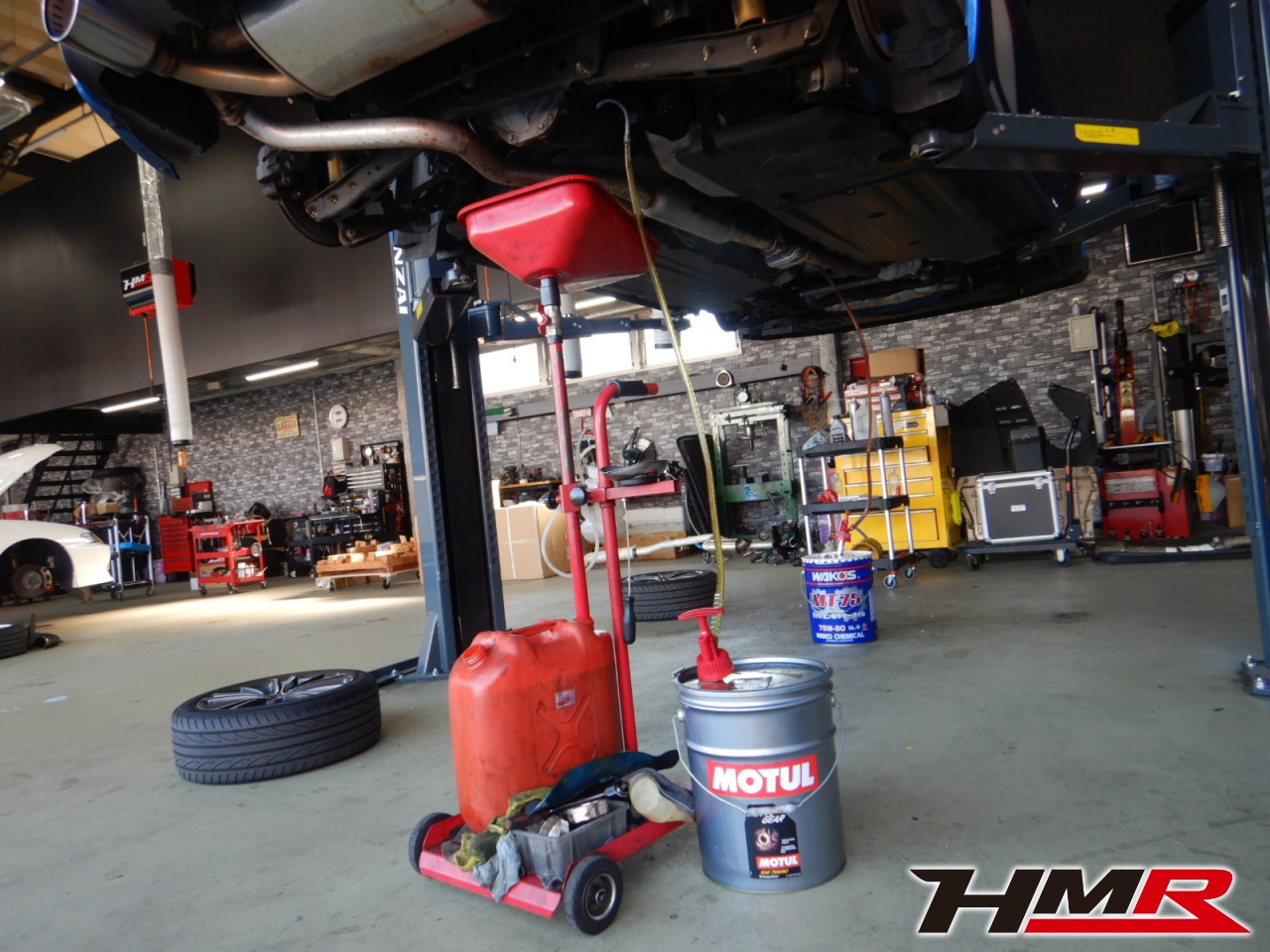 HMRでは納車前点検でエンジンオイル・オイルフィルター・ブレーキフルード・ミッションオイル(MT車のみ)・デフオイル・ラジエタークーラント(スーパークーラントは量調整)を新品交換しています。油脂類がリフレッシュされていれば納車してすぐのドライブも安心して楽しめますね。エンジンオイルはエンジン内部の潤滑および冷却を行います。定期的なエンジンオイルの交換を行わず走り続けるとエンジン不調の原因となります。使用状況によりますが半年または5,000kmでの交換をおススメいたします。それではエンジンオイルを抜いていきます。