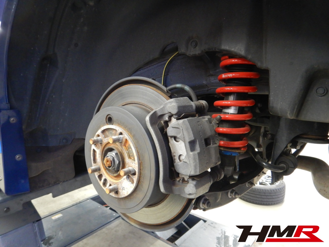 リフトアップして足廻りをチェックしていきます。まず最初にタイヤを縦横に揺らしてハブベアリングとボールジョイントのガタがないかチェックを行います。つづいてタイヤを回してベアリングの状態とブレーキの引きずりをチェックします。走行中に異音やハンドルのガタつきなどを感じた場合は当店へお早めにご相談下さい。