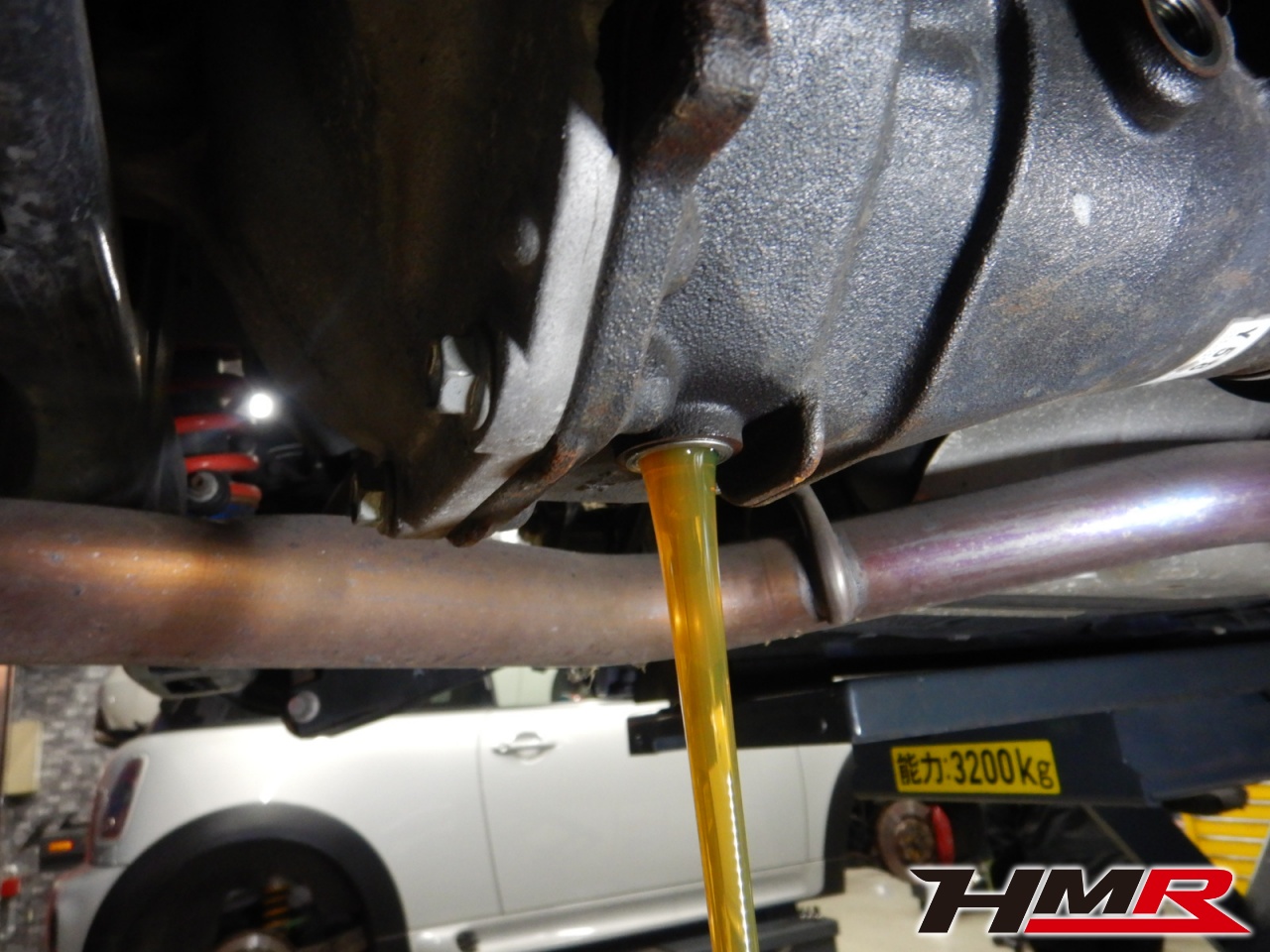 HMRでは納車前点検でエンジンオイル・オイルフィルター・ブレーキフルード・ミッションオイル(MT車のみ)・デフオイル・ラジエタークーラント(スーパークーラントは量調整)を新品交換しています。油脂類がリフレッシュされていれば納車してすぐのドライブも安心して楽しめますね。エンジンオイルはエンジン内部の潤滑および冷却を行います。定期的なエンジンオイルの交換を行わず走り続けるとエンジン不調の原因となります。使用状況によりますが半年または5,000kmでの交換をおススメいたします。それではエンジンオイルを抜いていきます。