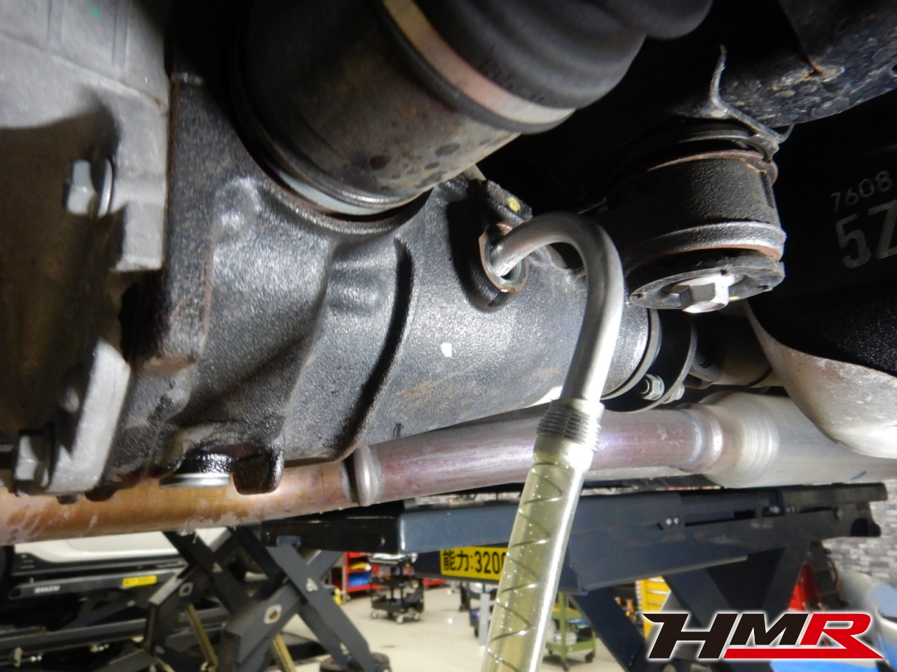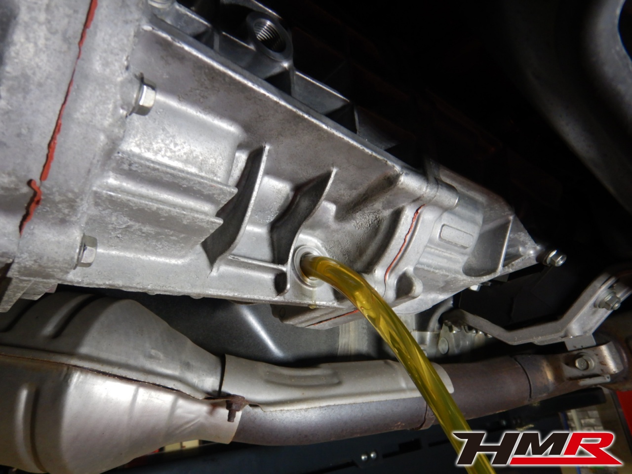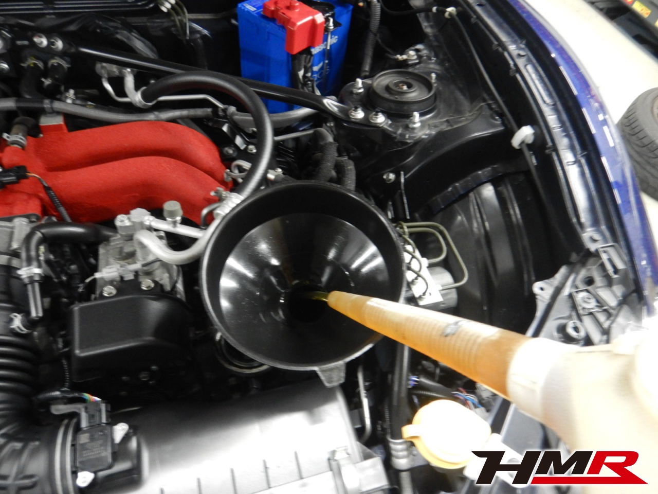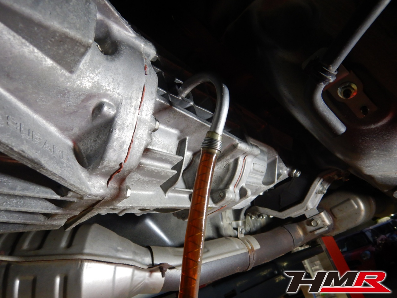 HMRでは納車前点検でエンジンオイル・オイルフィルター・ブレーキフルード・ミッションオイル(MT車のみ)・デフオイル・ラジエタークーラント(スーパークーラントは量調整)を新品交換しています。油脂類がリフレッシュされていれば納車してすぐのドライブも安心して楽しめますね。エンジンオイルはエンジン内部の潤滑および冷却を行います。定期的なエンジンオイルの交換を行わず走り続けるとエンジン不調の原因となります。使用状況によりますが半年または5,000kmでの交換をおススメいたします。それではエンジンオイルを抜いていきます。