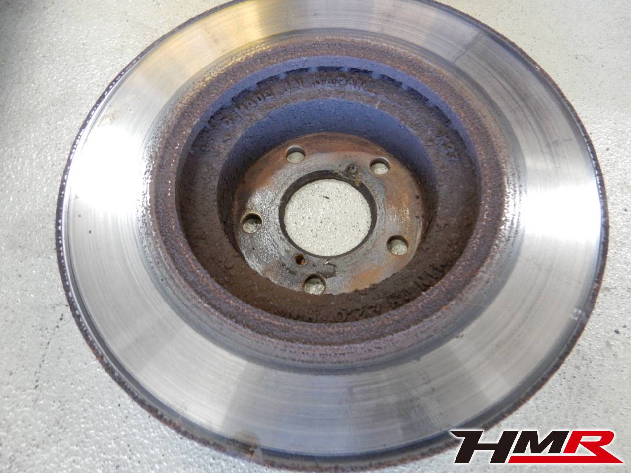 取り外し前のフロントブレーキローターです。 表面にローターによる傷とポツポツ小さな錆が無数確認できます。また外周などにも錆が目立っております。