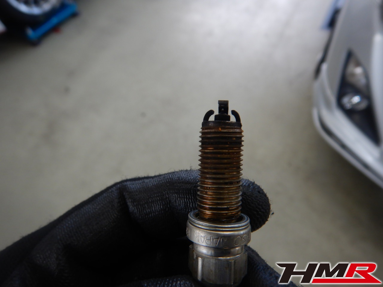 次にプラグのチェックを行いました。イリジウムプラグが装着されています。4本とも特に問題ありませんでした。イグニッションコイルと合わせて交換するとエンジン出力が戻るぐらい86はプラグとコイルが経年劣化します。10万kmまでにはプラグとコイルの交換おススメさせていただいております。先端の部分がひどく汚れてしまうとエンジンが掛かりづらくなったり、走行中に失火が起こり故障の原因となります。エンジンが掛かりづらくなるなどの症状が出た場合は当店にご相談ください。
