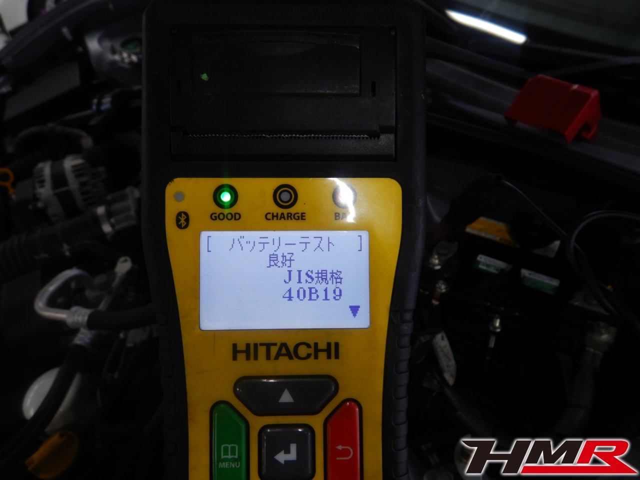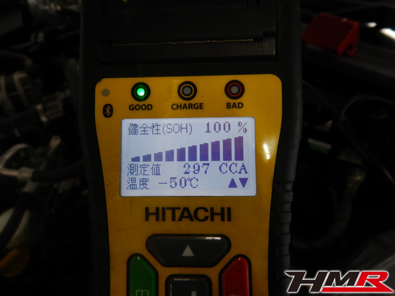 バッテリーの健全性をチェックしていきます。テスターで確認したところ健全性に問題ありませんでした。バッテリーの交換時期は、使用状況にもよりますが3〜5年が目安とされています。定期的な点検をおススメいたします。
