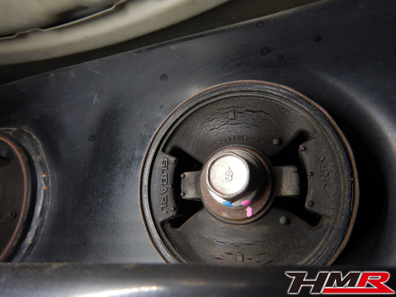 86/BRZではポピュラーな劣化箇所なので下を覗き込んだ時にオイル跡やそれらしき跡が見られたら点検することをおススメします。今回チェックしたところ、進行方向右側のブッシュに中程度のヒビが見つかりました。