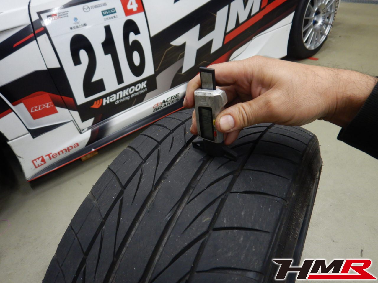 タイヤ溝の残量をチェックしていきます。フロント5mm・リア4mmでした。