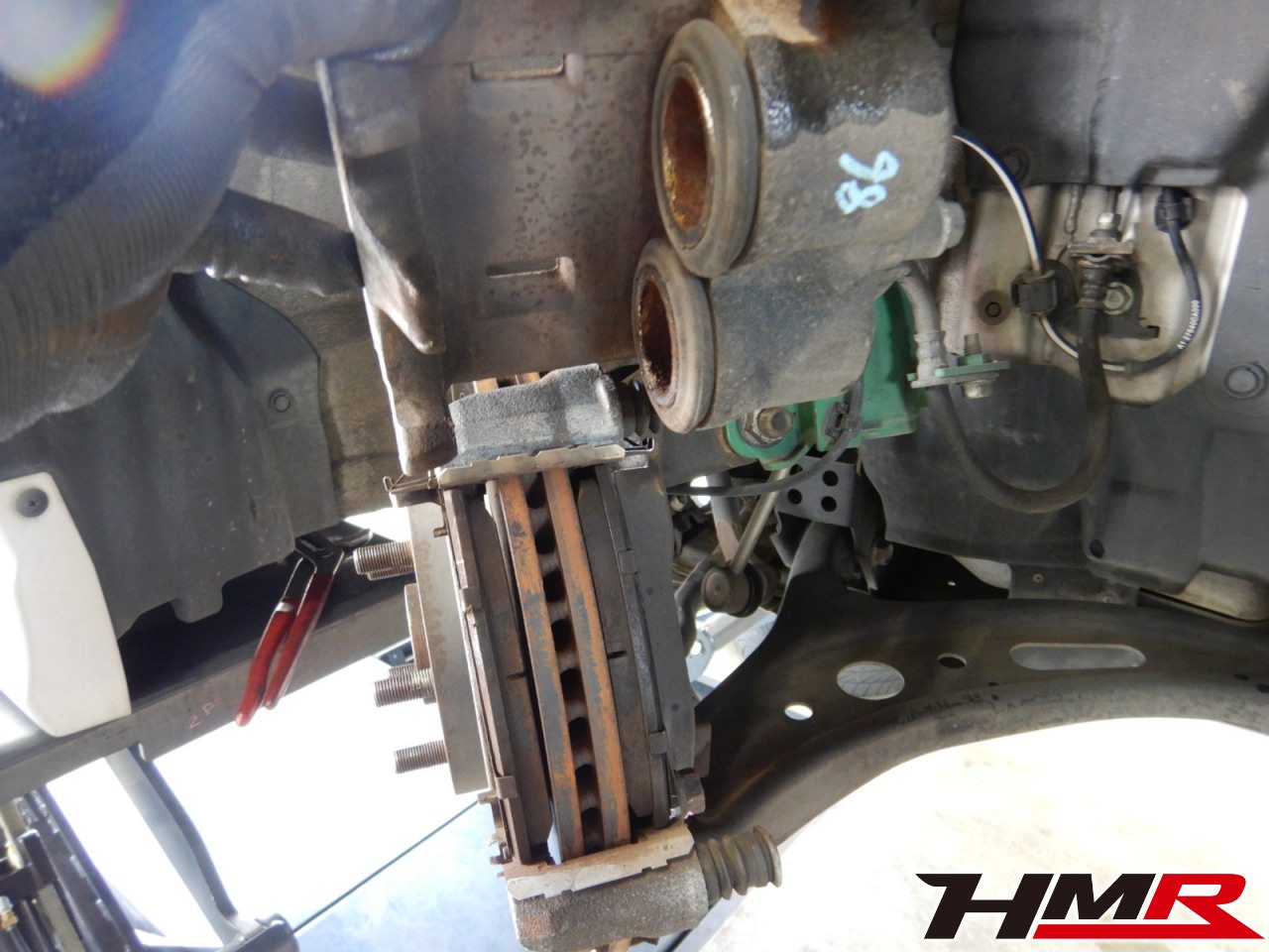 続いてリフトアップして足廻りをチェックしていきます。まず最初にタイヤを縦横に揺らしてハブベアリングとボールジョイントのガタがないかチェックを行います。左リアハブボルトにネジ切れがあったので修正いたしました。走行中に異音やハンドルのガタつきなどを感じた場合は当店へお早めにご相談下さい。